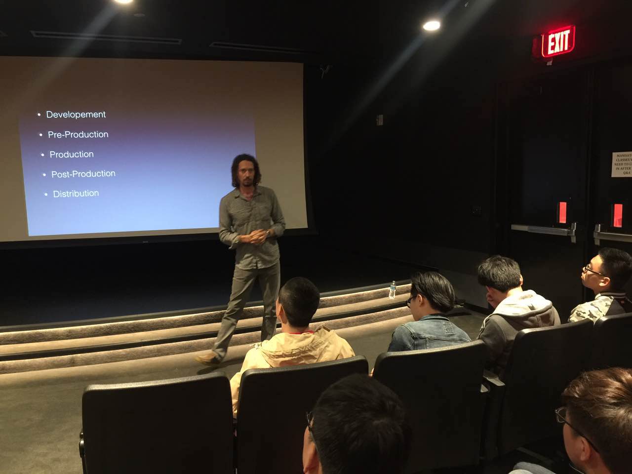 午餐过后,同学们参加了由纽约电影学院洛杉矶校区多文化中心主任kelly Gardener主讲的有关电影拍摄流程的讲座,Gardener主任深入浅出、幽默风趣的讲座,引得了同学们的阵阵掌声,讲座结束后同学们积极的向Gardener老师就电影拍摄提出问题进行讨论。讲座结束后,同学们在纽电专业老师的陪同下,我们参观了纽约电影学院位于环球影城的拍摄基地。在参观途中,国际部同学们遇到了正在实地拍摄的纽电的同学,两校同学之间就电影专业的问题进行了积极的交流。