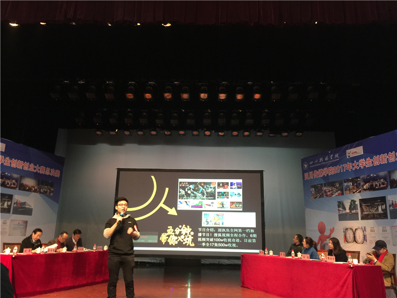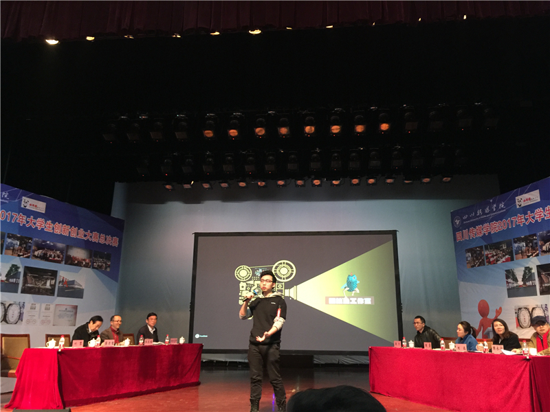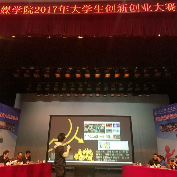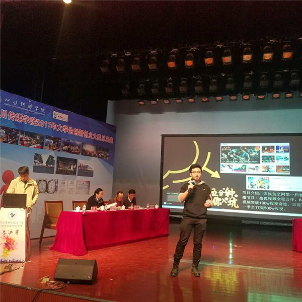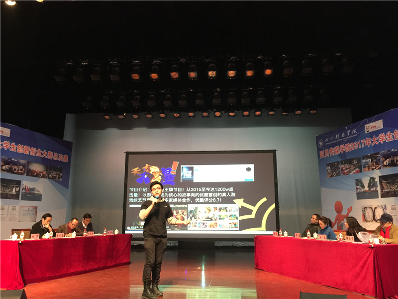 四川传媒学院是一所十分注重创新创业人才培养的大学,我校积极响应习主席在十八届五中全会提出的“大众创业,万众创新”理念, 一直鼓励我校学生努力创新创业、为他们提供专业咨询与创业帮助,并提出了“大一有想法,大二有规划,大三有行动,大四有成果”的号召。 今日上午,我校2017年大学生创新创业大赛总决赛已拉开帷幕,在此热烈祝贺我部英语班同学王钰丰成功入围。 王钰丰同学是国际部英语班的学生,在校期间创建了固执鱼工作室,如今在网络综艺节目行业已经取得了一定的成就和荣誉。 他的工作室同土豆、优酷、搜狐、56、腾讯、火猫TV、头条号、Bilibili等大型网站进行合作,推出了《天才力量》的游戏视频栏目, 如今播出了两季,视频点击量已达到一千二百九十余万。王钰丰同学的创业口号是:“化身一条固执的鱼!逆着洋流独自游到底!” 游入大海成蛟龙,撒向天空皆是星。我校莘莘学子在创新创业的道路上,越走越宽阔!