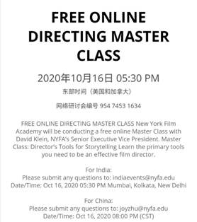 北京时间10月16日晚8点,影视摄影与制作专业2018、2019、2020级的学生们齐聚一堂,聆听来自纽约电影学院执行副院长——大卫·克莱恩(David Klein)的大师讲堂。在此次讲座中,他带领我们学习掌握了有效的电影导演叙事技巧。