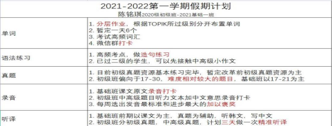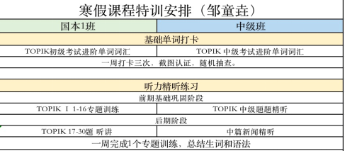 寒假伊始,对于其他学生来说,假期意味着惬意时光;意味着辞旧迎新;但是对于正在备战2022年4月份TOPIK韩语能力考试的韩语组学生却是无比珍贵的蓄能时光。为此韩语组的老师在学期结束时就为学生们量身定制了寒假学习计划,为学生的寒假学习指明方向。
