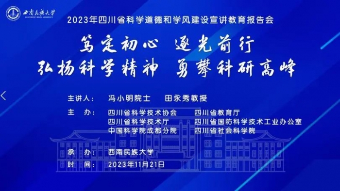 11月21日,四川省科协、教育厅、科技厅、省国防科工办、中科院成都分院、省社科院联合举办了“2023年四川省科学道德和学风建设宣讲教育报告会”。此次报告会的主题为“笃定初心 追光前行——弘扬科学精神 勇攀科研高峰”,旨在深入贯彻习近平新时代中国特色社会主义思想,全面落实党的二十大会议精神,切实加强科研作风和学风建设,积极营造良好科研生态和舆论氛围。