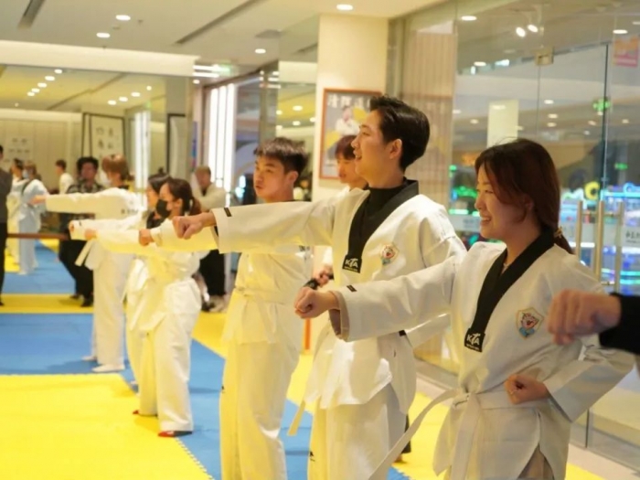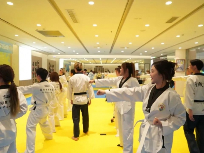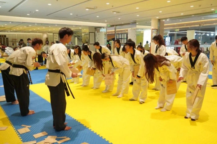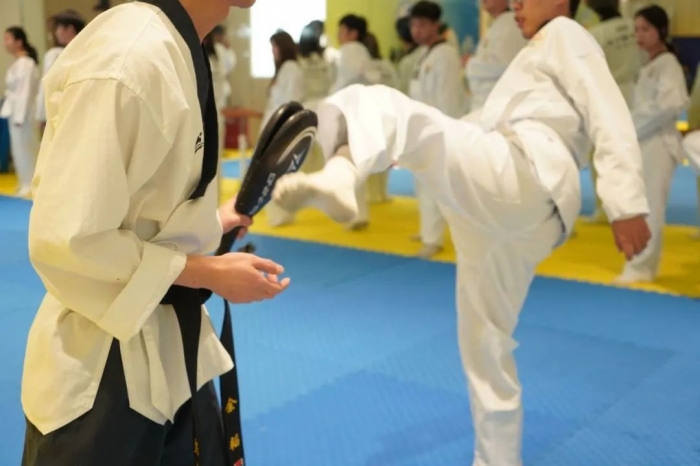 在体验教学活动正式开始之前,教练讲授了中国和韩国传统体育运动的渊源和历史,分享了跆拳道 “礼义廉耻,忍耐克己,百折不屈”的运动精神,强调在运动中学习尊重、谦虚和坚韧不拔的体育品格,鼓励同学们在训练中挑战自我,超越自我。