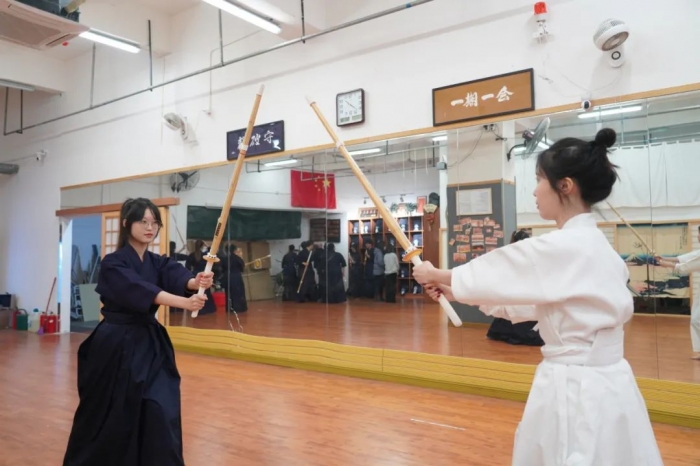 经过热身运动和基本剑道动作的练习后,教练们还带领学生进行了些简单的攻防对练训练。学生通过观摩和模仿,在巩固日语表达的同时熟悉剑道的动作要领。