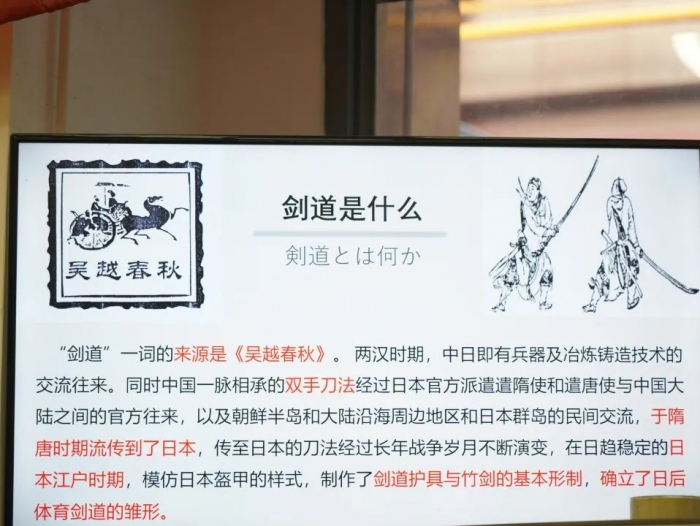 由日语教研室的老师们为学生们介绍了中日两国剑道的历史渊源、蕴含的“重信义,尽忠诚”、“交剑知爱”的体育精神,以及剑道装备的组成,并结合日语的敬语体系讲解了剑道中的礼仪,让学生对剑道有一个基本的了解,明确了剑道起源于中国,是一门通过修习剑的理法,来形成人格之道的运动。剑道修炼要求练习者以至高的敬畏之心对待剑道礼节,虔诚地向国旗、教练师长和对手敬礼。不仅要在剑道技术上进步,更以追寻自我突破为己任,坚持提升内在修养,深爱国家和社会,心系人类和平繁荣,为推动世界向着更美好的方向努力奉献一己之力。这些正是高校课程美育教育中一直强调的优秀品格。