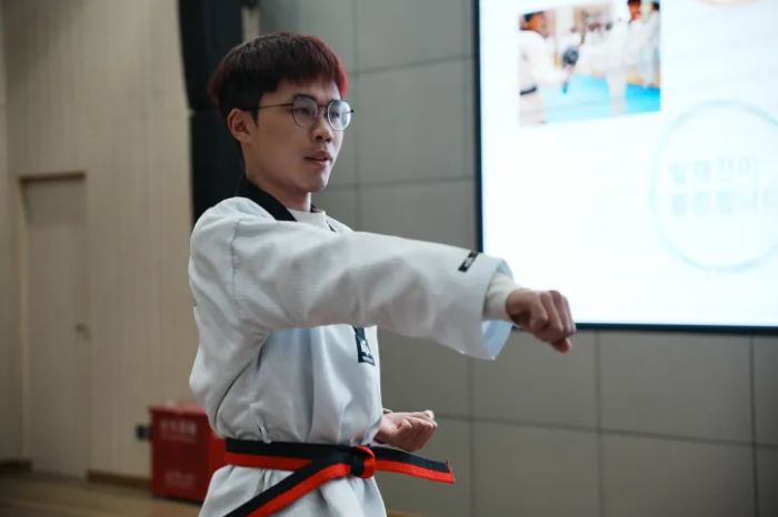 随后的韩语发表环节,同学们分别从跆拳道起源与历史、动作讲解、活动感悟、体育竞技等方面分享了自己参加跆拳道体验活动的所学和收获。金泰同学还穿上跆拳道服,为大家展示了跆拳道竞技动作,将现场气氛推向了高潮。