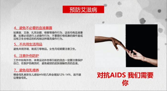 宣讲团首先向同学们介绍了艾滋病的起源、病因和临床表现。艾滋病,全称获得性免疫缺陷综合征,是由人类免疫缺陷病毒(HIV)引起的。这种病毒会攻击人体免疫系统,使人体逐渐丧失对各种疾病的抵抗能力。艾滋病的传播途径主要包括性传播、血液传播和母婴传播。高危人群包括男男性行为者、多性伴者、静脉吸毒者等。