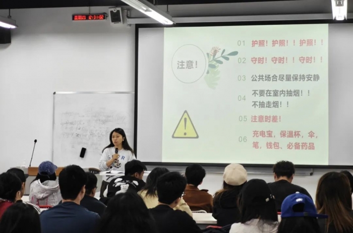 何竞老师首先向同学们强调了海外交流学习的重要性以及对学生国际视野拓宽的重要意义,简要介绍了历年我院学生参与海外交流学习项目的基本情况,并从外事纪律、团队教育、行前指南等方面对行前安全问题进行了详细的指导,强调了同学们在海外交流学习期间加强安全防范意识的必要性,同时表达了学院对同学们的殷切希望。