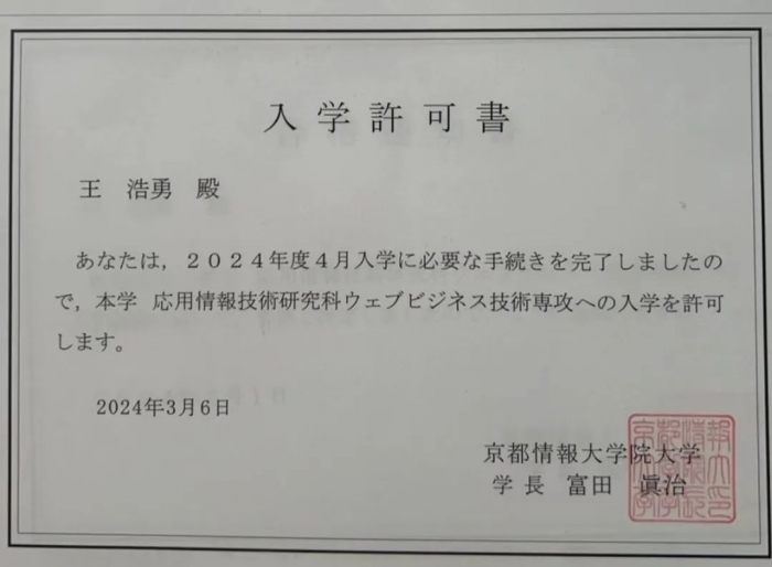我院毕业生王浩勇入学京都情报大学院大学