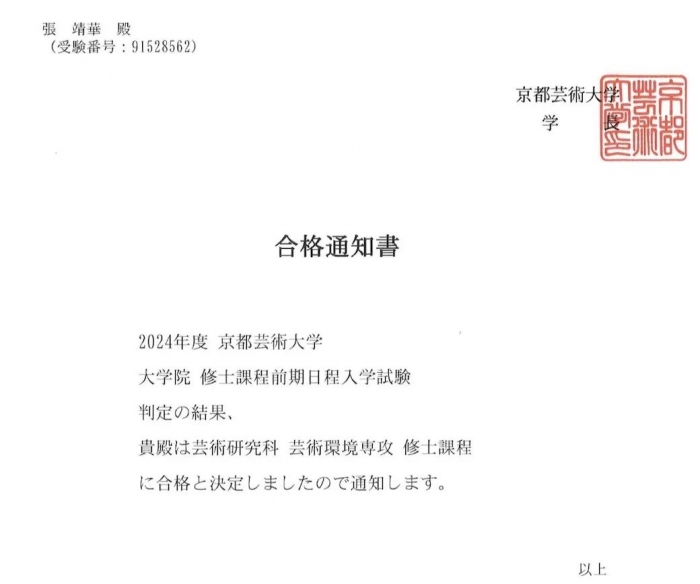 我院毕业生张靖华入学京都艺术大学
