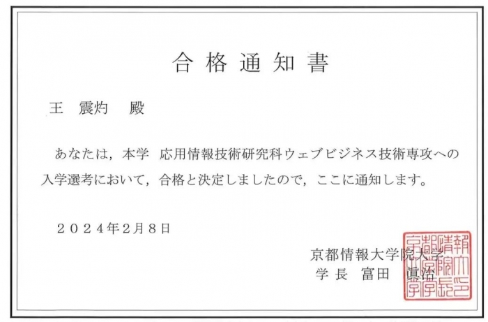 我院毕业生王震灼入学京都情报大学院大学