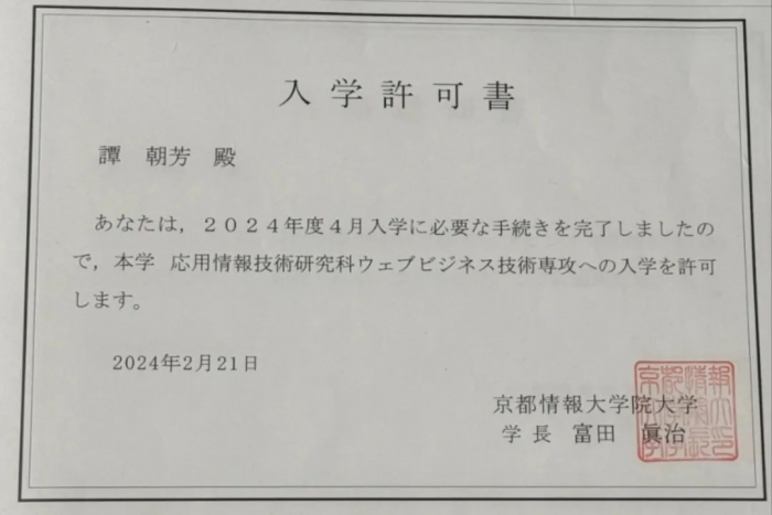 我院毕业生谭朝芳入学京都情报大学院大学