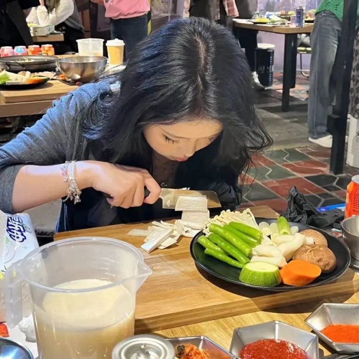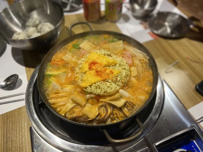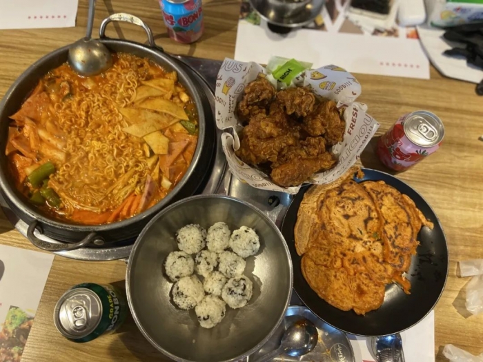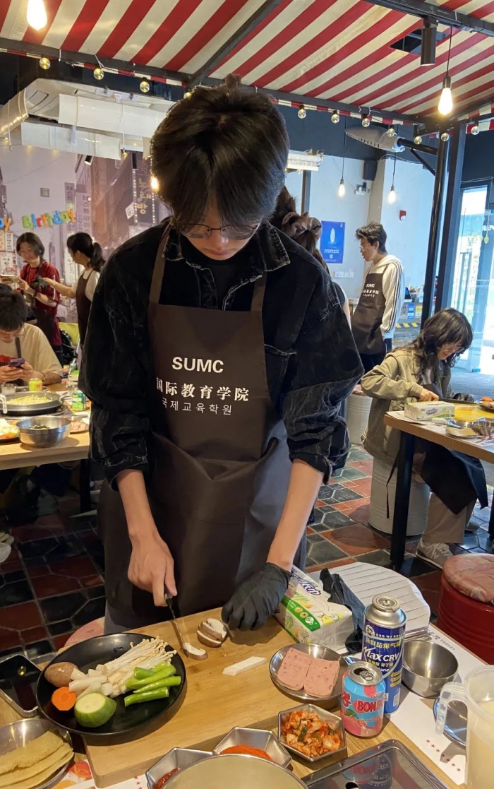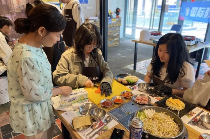 进入实践环节,同学们早已摩拳擦掌、迫不及待地想要展示自己的厨艺。每个小组的成员需要分工协作,齐心协力在限定的时间内完成一道主菜——部队锅的烹制,并搭配制作泡菜饼和饭团这两道小食。组内成员各司其职,有的负责切菜,有的负责摆盘,有的专注于煎泡菜饼。