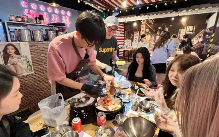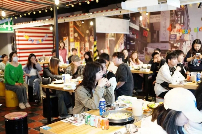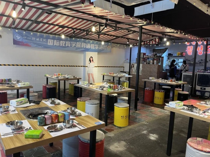 进入活动场所,仿佛置身韩国街头,场内设计模仿韩国街边的帐篷小店,同学们从进门打招呼到点餐,都需要独立运用韩语与韩国店员进行沟通,将课堂所学真正转化为实际应用。