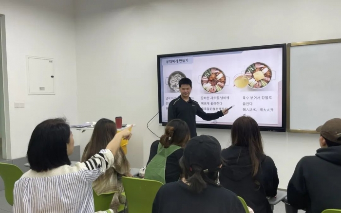在实地体验活动开展之前,韩语教研室的各位老师向同学们讲授了韩国的餐桌礼仪、点餐用语,并复习了饮食相关的韩语知识点,帮助他们增进对于饮食文化的兴趣和理解,引导同学们在美食品鉴中提高审美力、享受学习的乐趣。