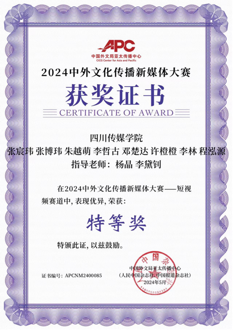在全球化的大潮中,新媒体以其独特的魅力和无限的可能性,成为了跨越国界、传播文化的重要桥梁。而在这个风起云涌的时代,一场盛大的文化盛宴正在上演。近日,中国外文局亚太传播中心(人民中国杂志社、中国报道杂志社)举办的“2024中外文化传播新媒体大赛”圆满落幕,四川传媒学院国际教育学院的代表作品《逐梦荣城》荣获全国特等奖。