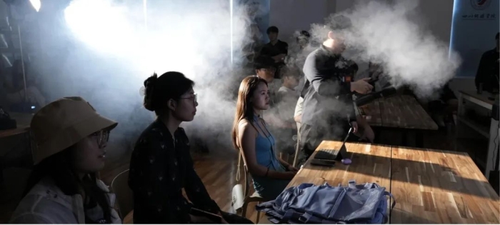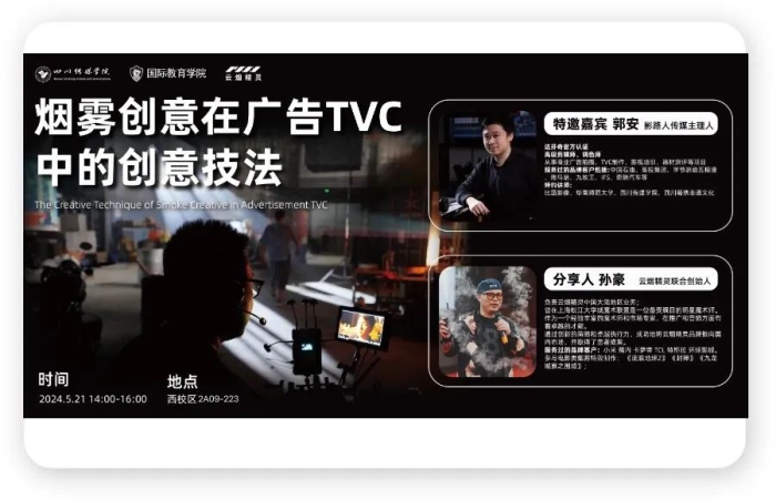 云精灵联合创始人孙老师则从创意的角度切入,向学生们展示了如何通过创意烟雾的方式来增强影视广告的视觉冲击力。孙老师的讲解包括如何在室内造云、制造烟雾泡泡,以及如何实现烟雾燃烧头发的效果等。他详细讲解了这些创意烟雾的实现方法和注意事项,并结合具体案例展示了这些技术在广告TVC中的应用。孙老师的讲解拓宽了学生们的创意思维,让他们了解了更多元的烟雾创意技法,为他们今后的创作提供了丰富的灵感来源。