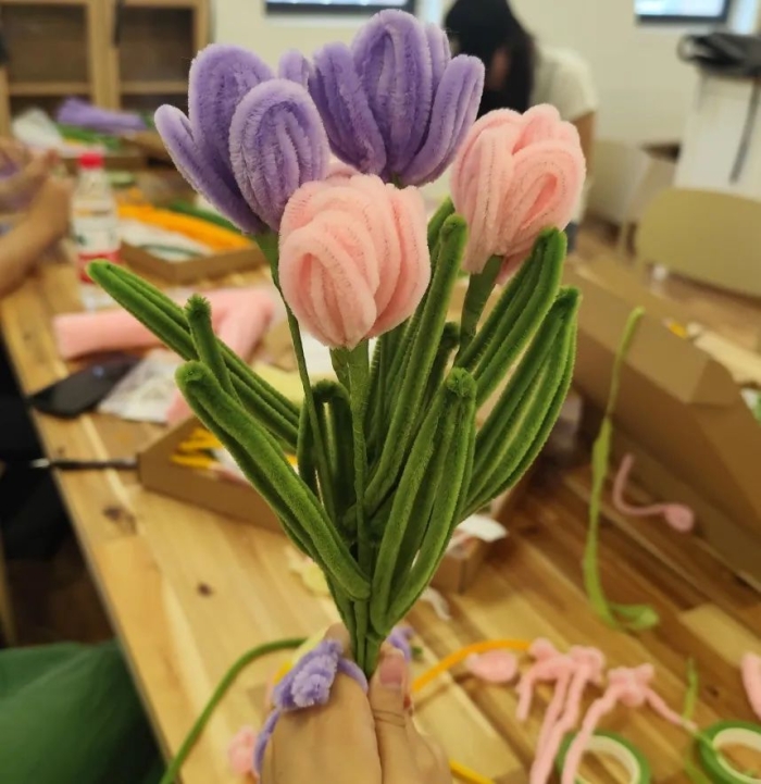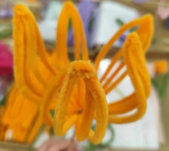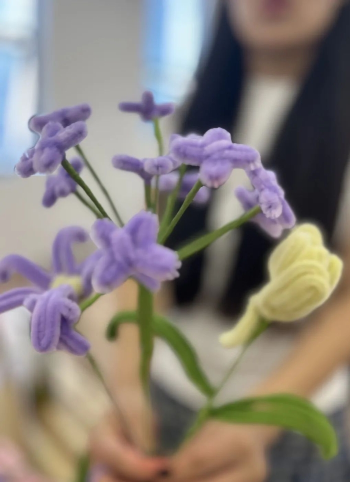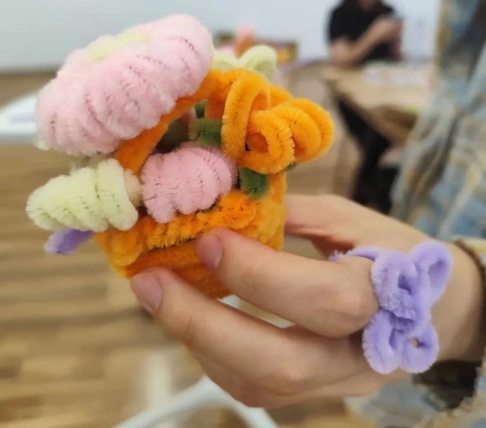 自由创作环节,同学们在老师的带领下,各自选择不同颜色的材料来搭配组合自己心中最美的花朵。创作过程充满乐趣,每一个别出心裁的作品都承载着创作者特别的情感,拥有独一无二的美丽。