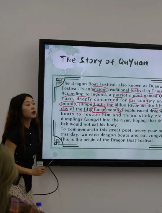 活动掠影 1 端午文化之旅 各班英语教师带领同学们用英语解读了端午节的历史由来、风俗习惯以及艾草香囊所承载的文化内涵。让同学们了解到端午节不仅仅是一个传统节日,更蕴含着深厚的家国情怀和民族精神。在讲述屈原忧国忧民、忠诚报国的伟大事迹时,同学们深刻体会到爱国主义是中华民族精神的核心。在介绍艾草香囊的文化内涵时,教师们强调了传统手工艺的传承与创新,鼓励同学们在尊重传统的基础上,勇于创新,传承和发扬中华民族的优秀传统文化。