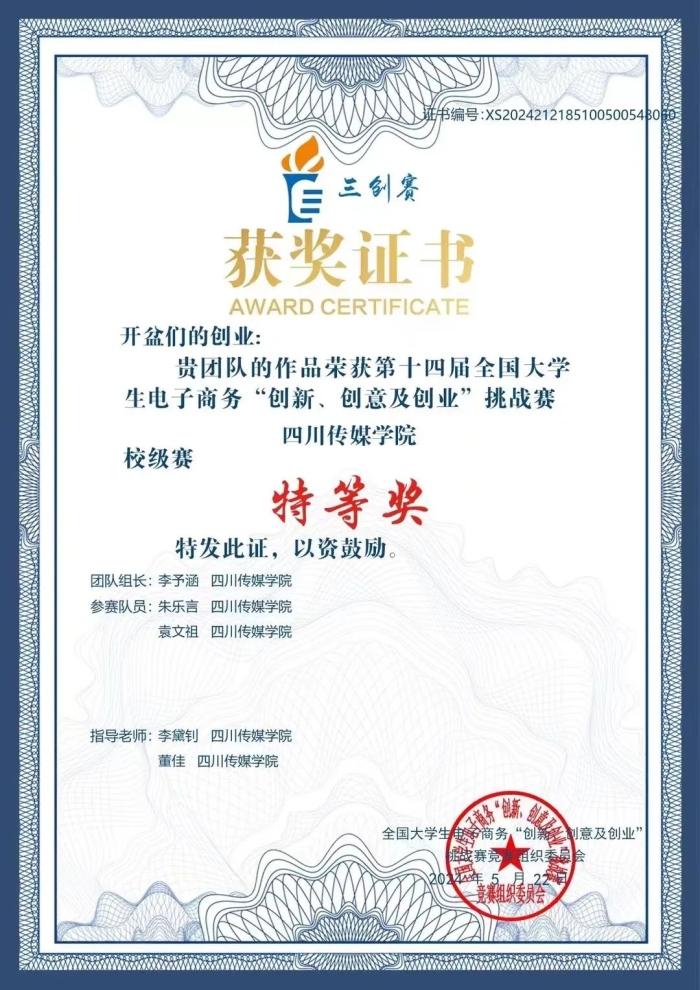 这支由董佳、李黛钊老师精心指导的团队,是由2022级影视摄影与制作(中外合作办学)专业的李予涵、朱乐言、袁文祖三位同学组成。他们凭借出色的创新思维和专业素养,在比赛中展现出了她们的创业潜力和实践能力。经过精心准备的创业计划书、生动的路演演示以及机智的答辩环节,得到了评委一致肯定,最终荣获省赛一等奖。