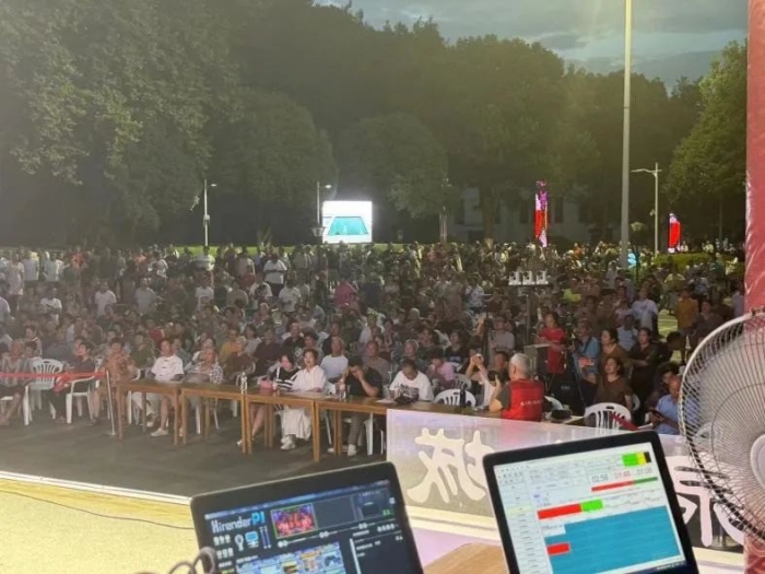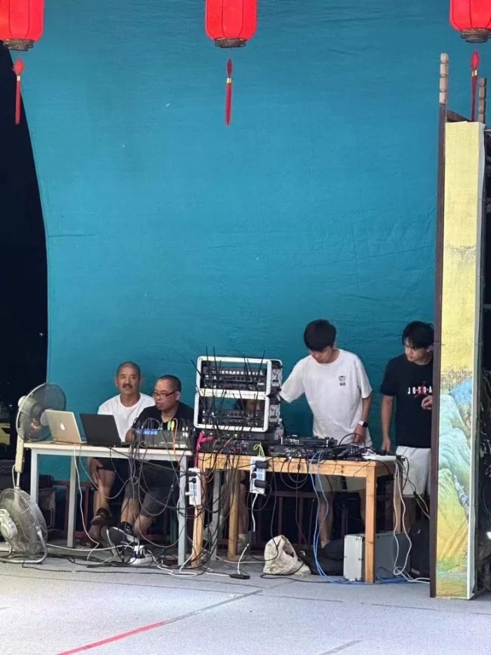 我所在实习地区的武义县每天晚上都会举办纳凉晚会,而我们的任务是需要拍摄晚会内容并进行线上直播。在前辈的带领下,我们提前前往活动现场进行直播前期准备工作,包括架设机器,调试设备等。尽管设备条件有限,但我们总是想方设法,利用现场可用的物品来优化拍摄效果,力求直播达到最佳状态。
