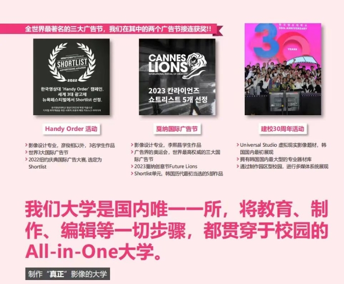 韩国映像大学成立于1991年,是一所在韩国教育部注册并通过中国教育部备案的正规职业技能型大学。该校专注于影视艺术教育,是韩国著名的实用影视艺术人才培养基地。学校专业设置广泛,涵盖映像演出、音效制作、映像摄影灯光等多个领域,强调实践教学,配备尖端设施。