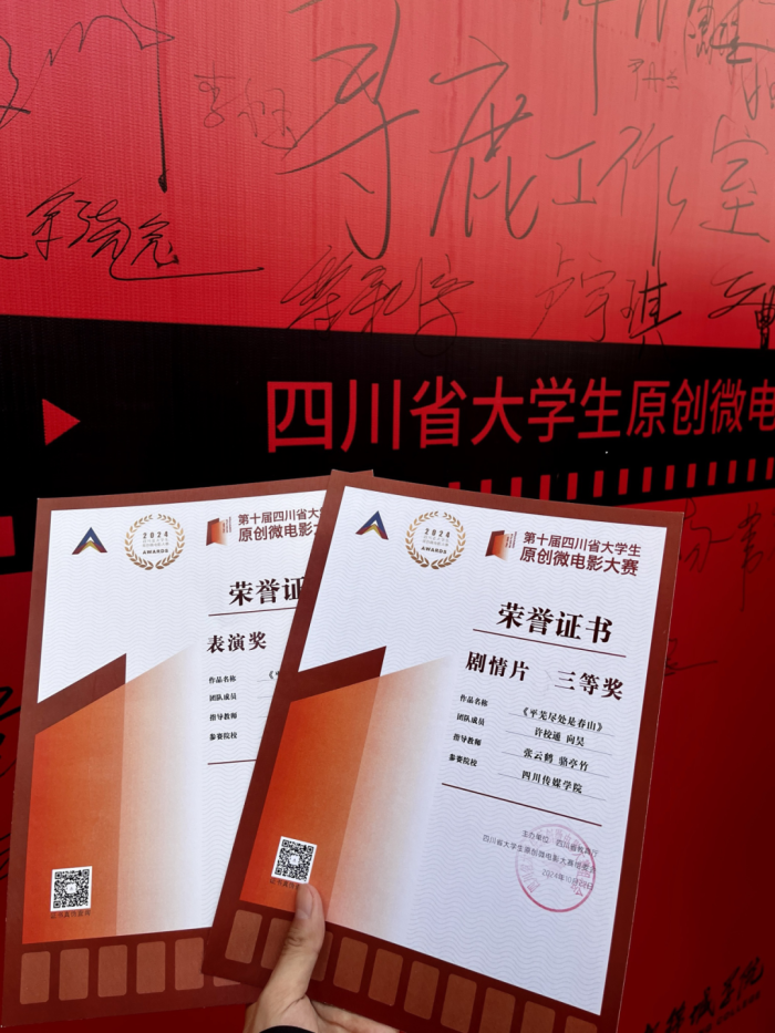 2023 级影视摄影与制作(中外合作办学)3 班的许校通同学,其导演的大一下期末作品《平芜尽处是春山》,凭借深刻的主题思想与精湛的制作水准,荣获第十届四川省大学生原创微电影大赛剧情片三等奖和表演奖三等奖。