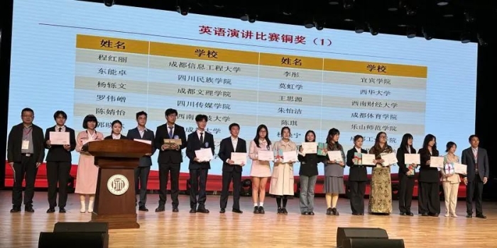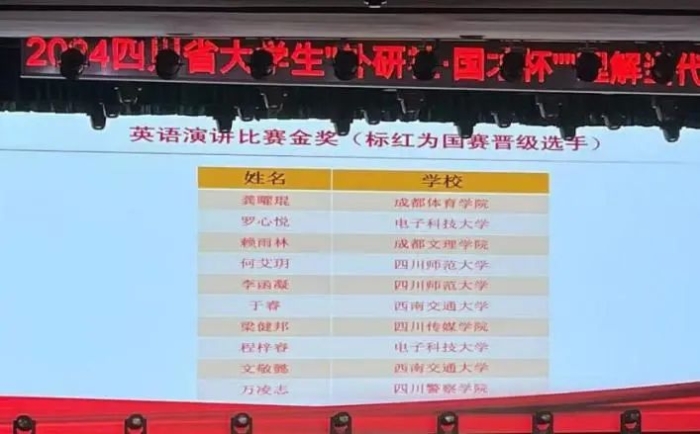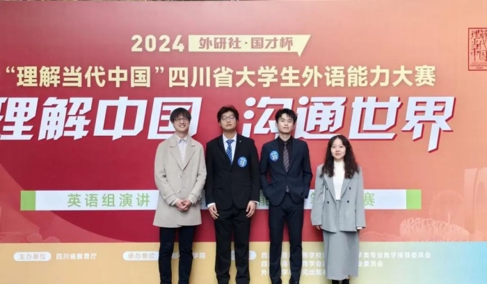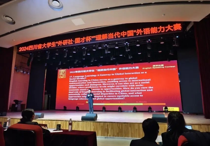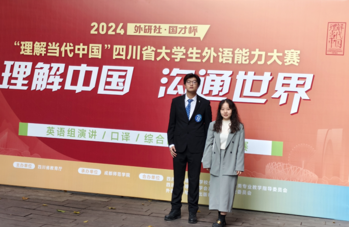 11月3日,2024四川省大学生“外研社·国才杯”“理解当代中国”外语能力大赛在成都师范学院举行,来自来自四川大学、电子科技大学、西南财经大学、四川传媒学院等多所本科院校的100名学生参与了此次大赛。日前在我校举行的校赛中,四川传媒学院国际教育学院罗伟嶒和有声艺术学院梁健邦脱颖而出,代表我校前往成都师范学院参加演讲大赛四川省省赛,喜获英语组演讲省赛金奖和铜奖,其中梁健邦同学顺利晋级国赛。
