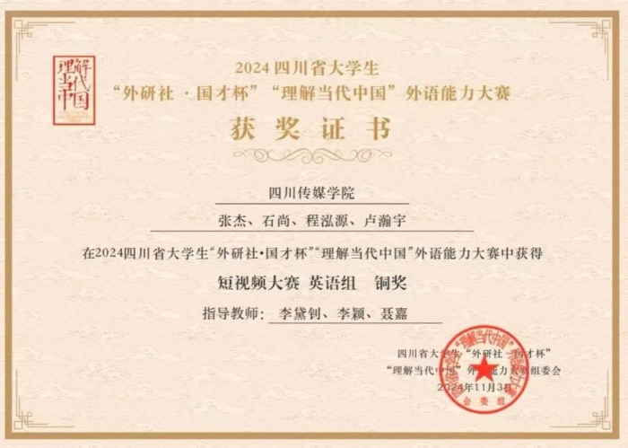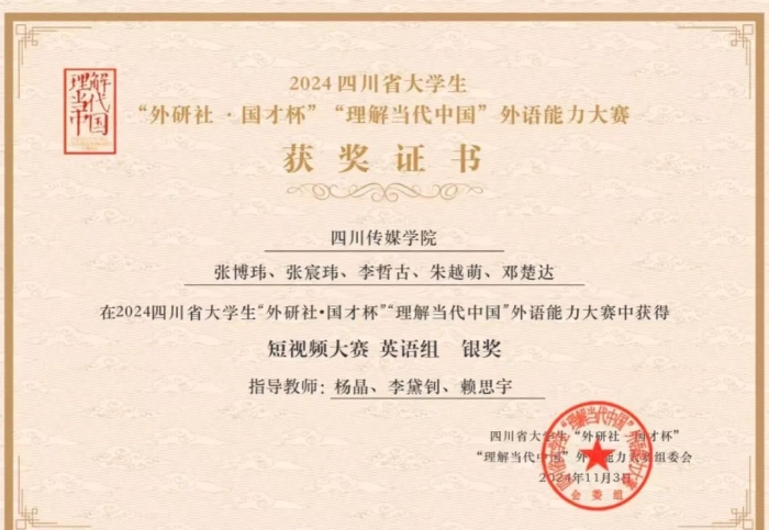 2024“外研社·国才杯”“理解当代中国”全国大学生外语能力大赛增设了短视频赛项,以鼓励大学生用生动、丰富、鲜活的方式讲述自己及身边的故事为目的,助力新时代大学生以数字化手段赋能国际传播。本年度英语组短视频赛项的比赛主题为“数字中国”。我院两个参赛组同学的短视频作品,在省赛中突出重围,分别荣获省赛银奖和省赛铜奖。其中,获得银奖的短视频作品在省赛阶段共1107所院校的6259个参赛作品脱颖而出,以其独特的创意和深刻的内涵,赢得了广泛赞誉,成功晋级国赛!