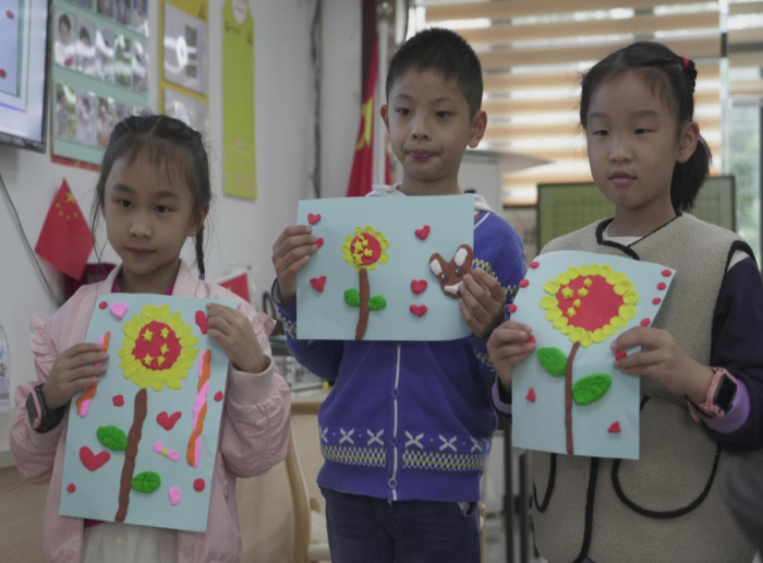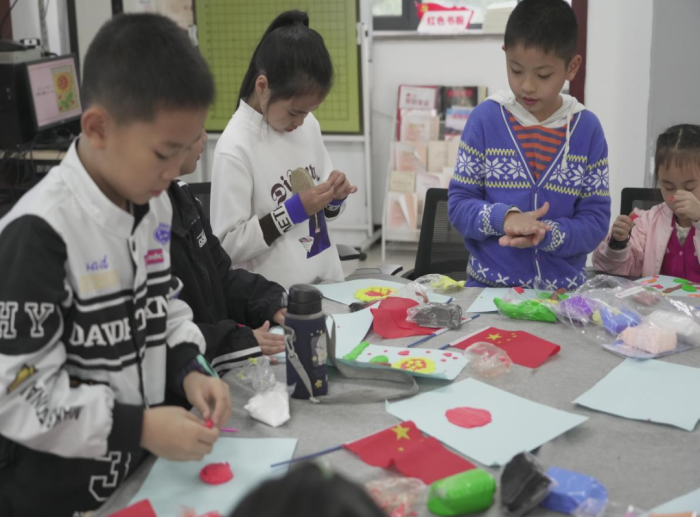 孩子们在志愿者的耐心指导下,边听边做,从状况百出到渐入佳境,他们用稚嫩的小手将粘土搓揉、塑形,不一会,一幅幅精美的黏土作品在他们的手下悄然诞生。每一颗五角星都凝聚着孩子们的心血,也映照出他们对祖国的深情。