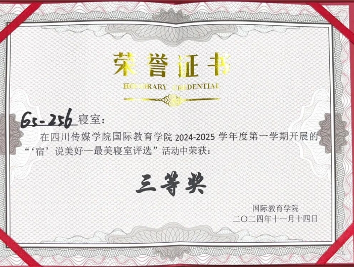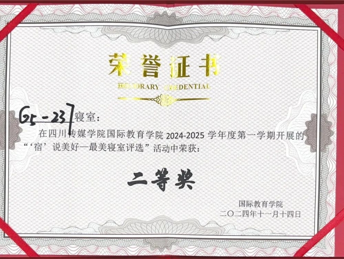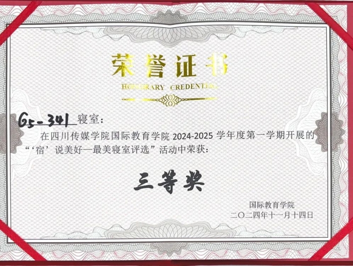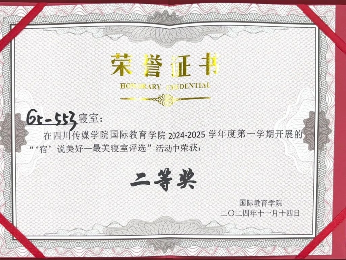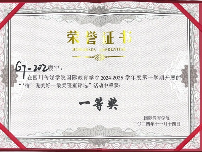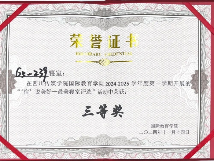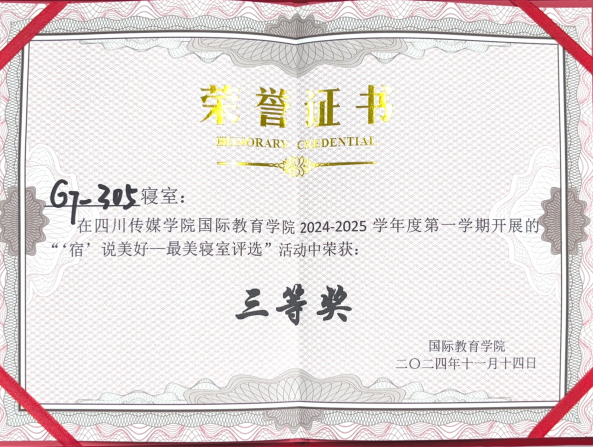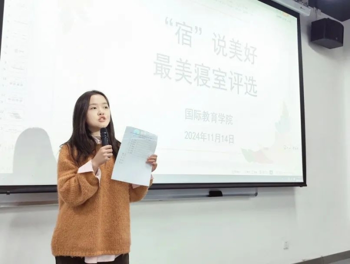 为了营造良好的寝室文化氛围,促进和谐的寝室关系,创建卫生、文明、整洁的寝室生活环境,引导学生崇尚劳动、尊重劳动,促进学生全面发展。11月14日,国际教育学院开展了2024-2025学年第一学期“‘宿说’青春最美寝室”评选活动。该活动由国际教育学院团书记黄守杰老师、2022、2024级辅导员唐思源老师、及2022级-2024级各10名学生代表组成评选小组参与投票,参评小组对参评寝室的卫生环境、物品摆放、寝室文化等标准进行考核评分,最终评选出7个“最美寝室”。
