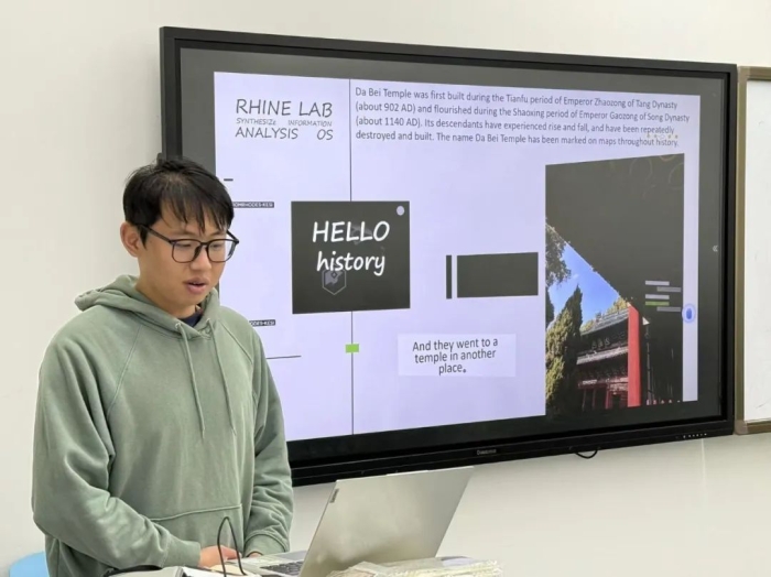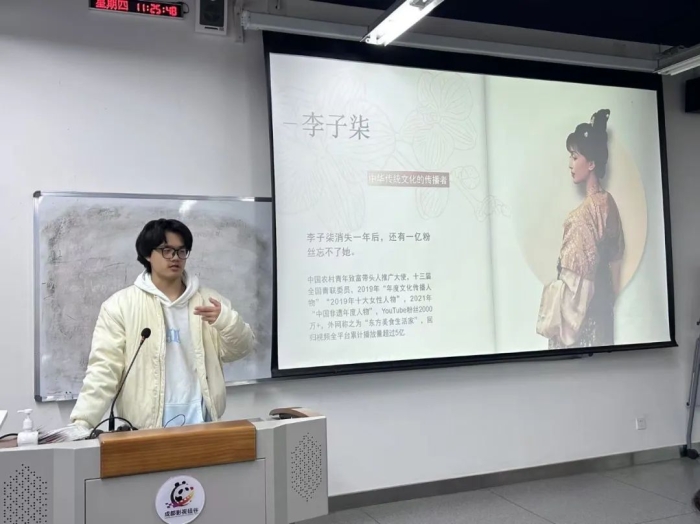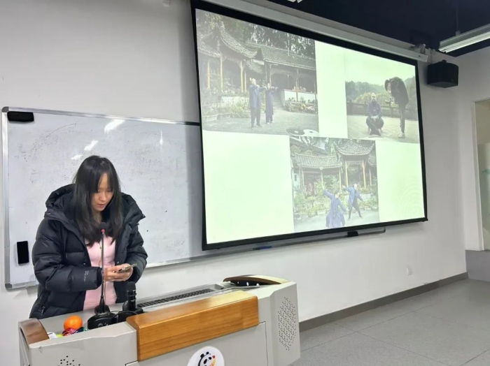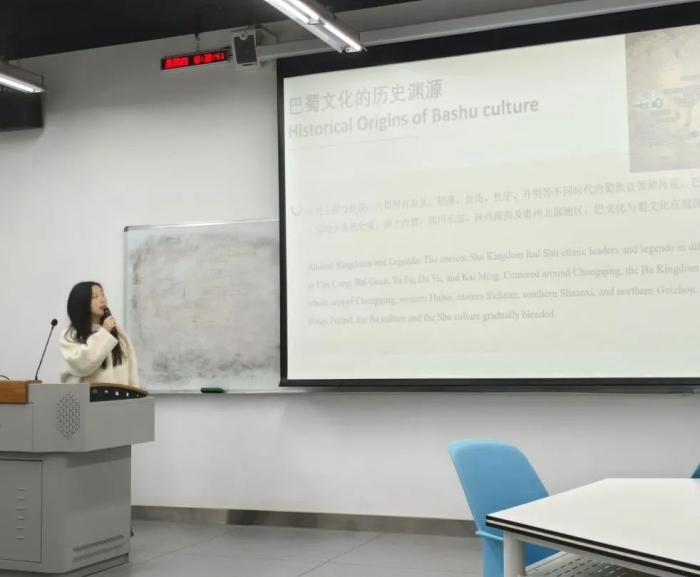 在“我的巴蜀文化故事”交流环节中,每个小组派出代表进行巴蜀文化主题的分享。有的小组展示了组员们巴蜀文化纪录片拍摄的幕后花絮,有的小组分享了自己对巴蜀文化的理解,还有的小组介绍了巴蜀文化的代表性人物或代表性的非物质文化遗产。