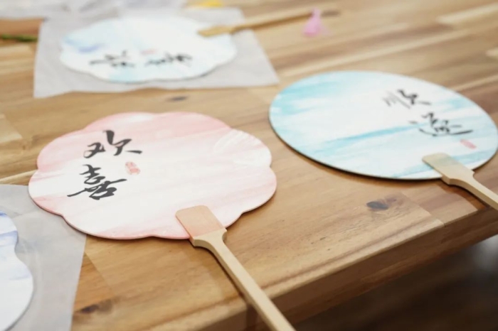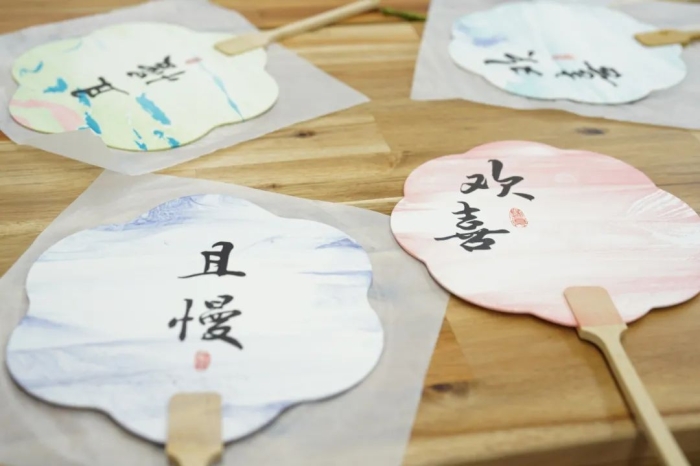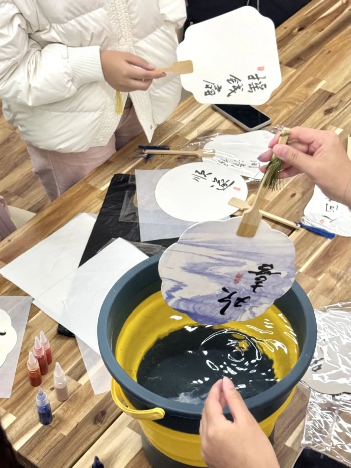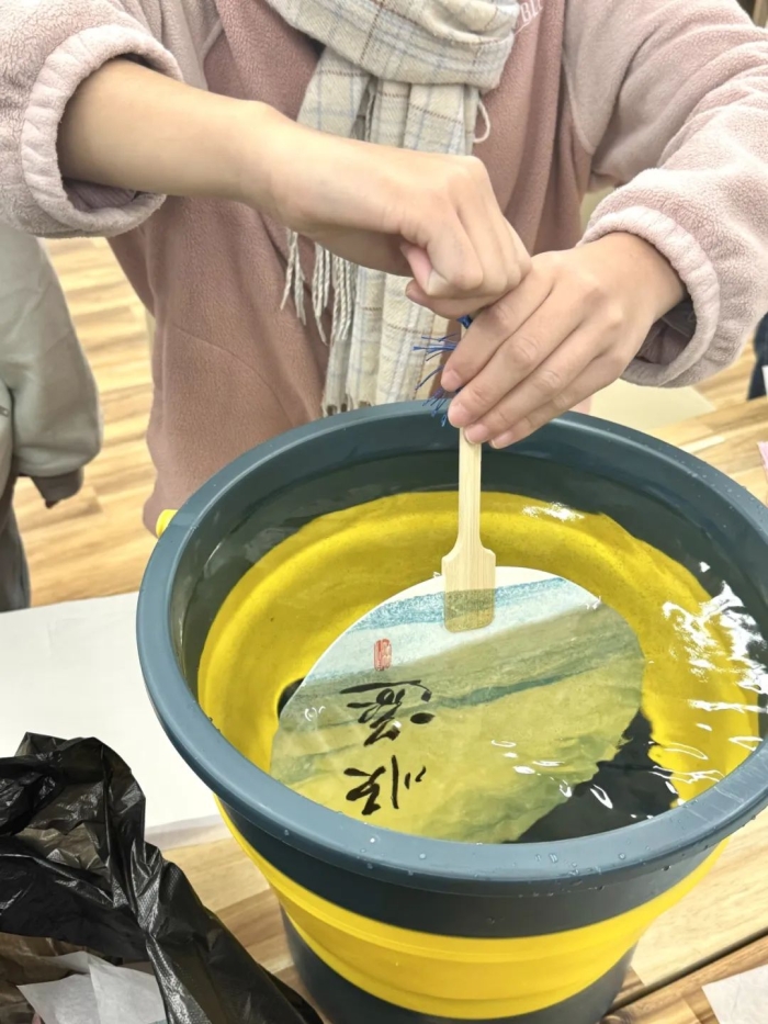 随后在志愿者的指导下,大家开始了非遗漆扇的制作体验。他们挑选自己喜欢的扇形,将扇子置于水中,精心勾勒、漂染。在制作过程中,大家相互交流学习,分享制作心得和技巧,现场气氛温馨欢乐。