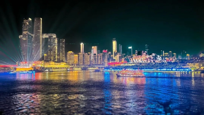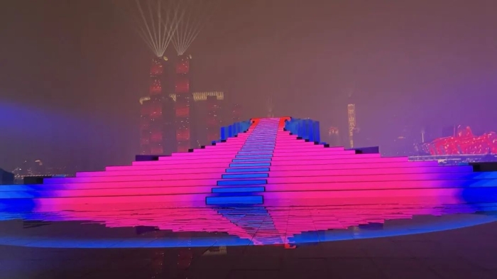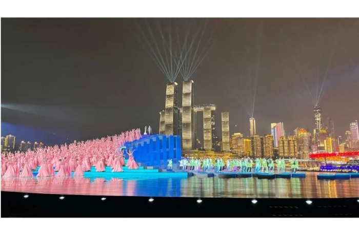 重庆分会场的舞台选址于南岸区弹子石广场,背靠长江与嘉陵江交汇的壮丽景观,以“山水之城”为主题,将自然地貌与现代科技完美融合。主舞台由 28 级台阶构成,象征重庆直辖28 周年的历史积淀,同时延伸至天空的无人机阵列与地面灯光形成立体空间,展现了“城市即舞台”的设计理念。作为场务人员,我见证了舞台从搭建到彩排的每个细节!从无人机编队调试到 780 辆“重庆造”智能汽车的灯光秀彩排,让我感受到祖国在科技方面所展现出的强大自信与创新魅力。