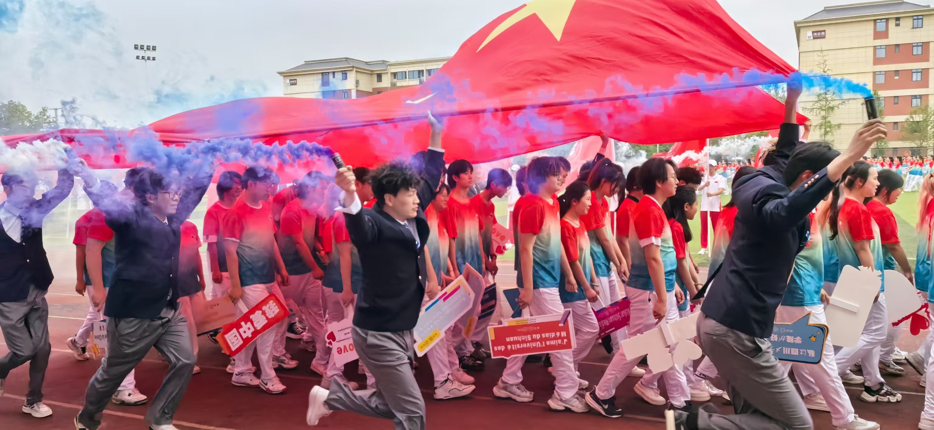 国教院的教师们也齐聚活动现场。他们热情高涨,挥动双手,口中不停呼喊着鼓励的话语,淋漓尽致地展现出国教师生昂扬向上的精神风貌,以及团结一心、携手奋进的强大凝聚力。伴随着飞扬而过的五星红旗和五彩的粉末礼花,运动会正式拉开序幕。