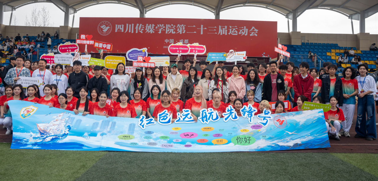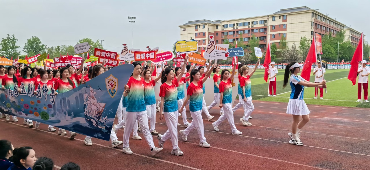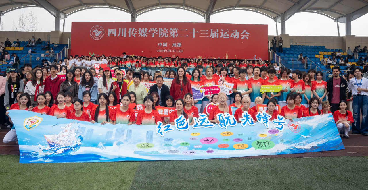 "红色远航先锋号"方阵,以党建为引领的巨轮正扬帆前行。用多国语言书写的"我爱中国、我爱川传"手牌,如同扬起的浪花,彰显着四川传媒学院学子的家国情怀。他们以红色基因铸魂,以传媒产业为翼,在"世界"的航道上劈波斩浪,用镜头语言向世界讲述中国故事。