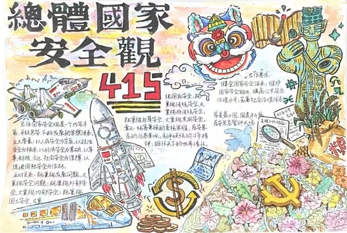 设计专业学子则以“总体国家安全观”为命题,用专业画笔解构抽象理论,创作主题手抄报。从数据安全到生态保护,从文化传承到科技自立,青年设计者通过视觉语言诠释多维度国家安全内涵,让理论可触可感,让教育入眼入心。