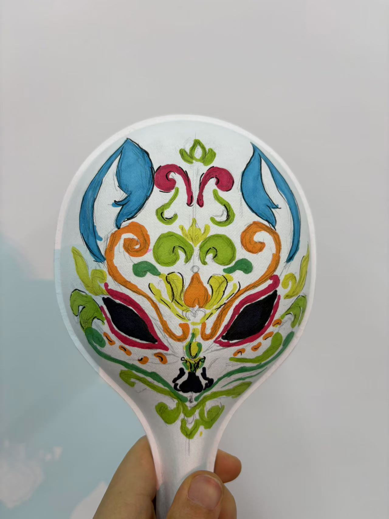 在创作环节中,同学们以马勺面具为“画布”,从“中国纹样元素池”中任选多个传统图案进行创新表达。有的将“盘长纹”与“云雷纹”融合,展现出连绵不断、生生不息的东方意境;有的以“冰裂纹”为底纹,勾勒现代化线条,演绎古今交汇之美;更有同学将中式经典花纹(如莲花纹、中式花卉纹)点缀其间,以创意诠释中式美学的理念。每一张面具都承载着同学们独特的文化理解与审美追求。