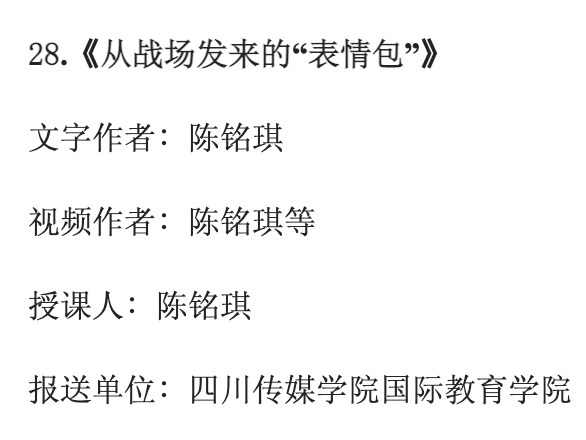 此次成功入选,既是对陈铭琪老师教学创新与课程设计能力的充分肯定,也是四川传媒学院国际教育学院坚持“以课程育人、以文化人”理念,推动爱国主义教育与国际传播深度融合的重要成果。