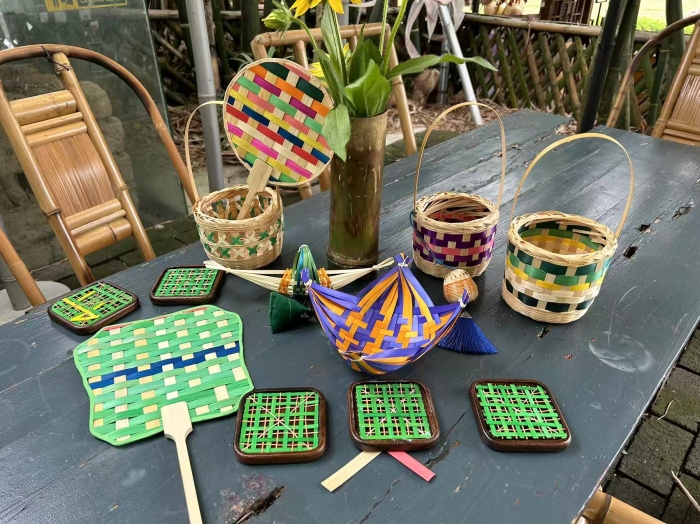 紧接着就是实操环节,在传承人的指导下,同学们纷纷动手尝试竹编制作。一根根竹篾在指尖穿梭,逐渐变成精巧的篮子、雅致的扇子、实用的杯垫……在编织的过程中,大家不仅学会了基本的竹编技巧,还发挥了自己的创意和想象,将传统工艺与现代审美相结合,创作出了一件件独具特色的竹编作品。