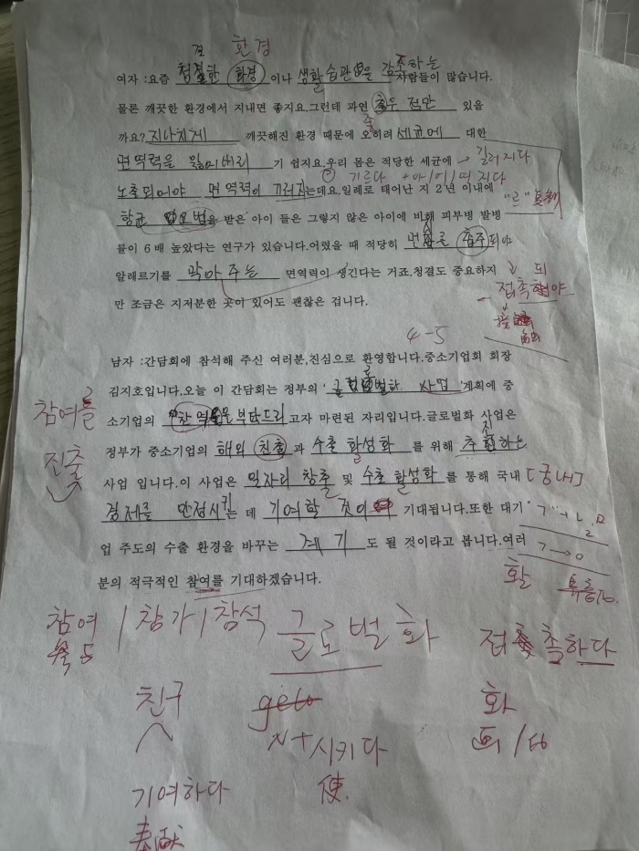 说起备考 TOPIK,我印象最深的就是听力带来的巨大挑战。当时离考试只剩一个多月,而听力恰恰是我的短板,这情形,就像要在短时间内翻越一座陡峭的大山,看起来几乎不可能。但转折点出现在听力老师的策略调整上。“与其广撒网,不如重点突破”,邹童垚老师说着便在我的错题本上画了个大圈,“这些高频难题才是你的登顶阶梯。”于是我的备考生活彻底变了样:课堂上我成了“信息侦察兵”,连老师停顿换气的间隙都在寻找关键词和转折词;往返教学楼与宿舍的路上,耳机里循环播放的不再是流行歌,而是真题中那些曾让我头皮发麻的新闻播报;甚至吃饭时打开的韩剧,都被我当成听力素材——关闭字幕,强迫自己用耳朵“咀嚼”台词。慢慢地我发现,当韩语成了我生活的背景音,我的耳朵似乎 “觉醒” 了,能更快理解对话的语境,曾经怎么也跨不过去的听力难关,竟然一点点被我突破了。