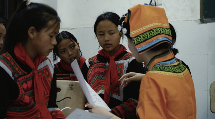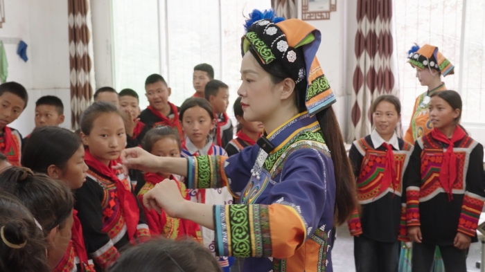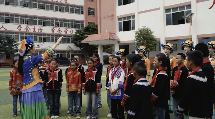 接着,老师和大学生志愿者带领彝族小朋友学习了《情深谊长》这首歌曲并进行了合唱编排。编排中老师还设计了互动式的演唱环节,大学生与孩子们交替领唱,通过肢体语言的配合,让“团结”的主题在旋律流动中自然传递,使合唱不仅是声音的共鸣,更成为情感联结的纽带。