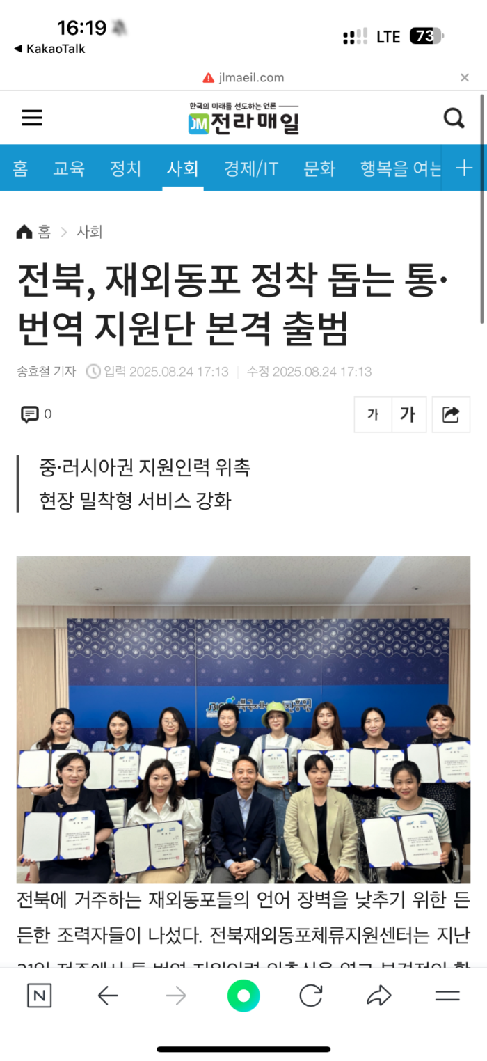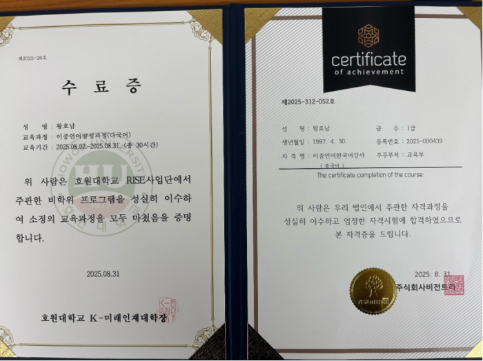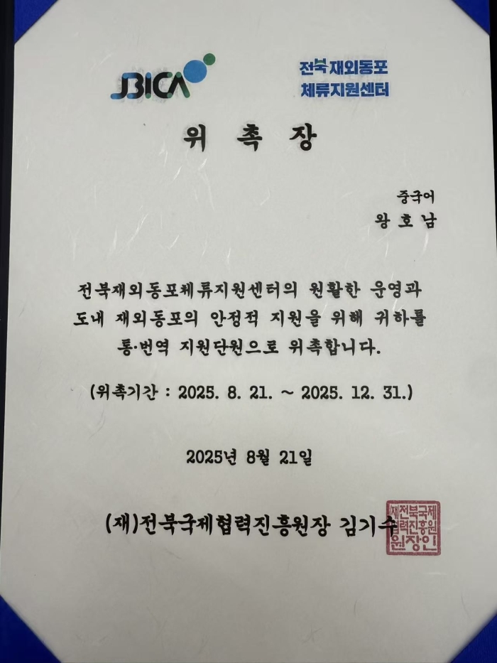 肩负重任,服务官方交流: 同样在2025年8月,王浩楠通过严格选拔,加入了全北在外同胞滞留资源中心,担任中国组辅助翻译(委任期:2025.8.21~2025.12.31)。在首次任务中,她协助接待了云南省人民对外友好协会专职副会长王宇女士一行。这次经历不仅提升了她的专业能力,更让她亲身体验并助力了中韩地方间的友好合作。