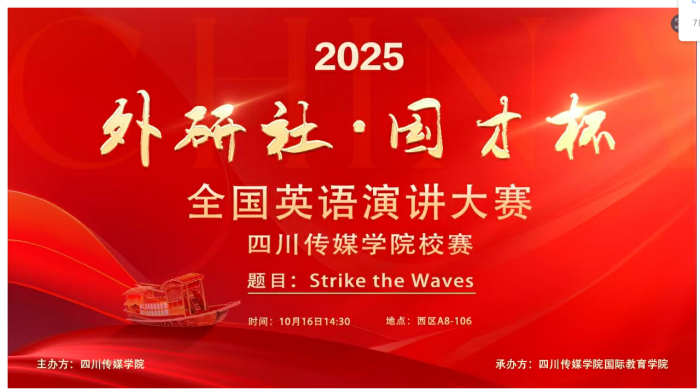 定题演讲环节以“Strike the Waves”为主题,选手需在3分钟内围绕该话题展开论述。从对“乘风破浪”精神的解读,到结合当代青年使命的思考;从个人成长经历的感悟,到对国家发展与时代机遇的探讨,15名选手各有侧重、视角独特。有的选手以生动的案例讲述自己突破困境、勇敢“逐浪”的故事,情感真挚动人;有的选手则立足宏观视角,分析当代青年在时代浪潮中应有的责任与担当,逻辑严谨深刻。标准的发音、流畅的表达、丰富的词汇,让每一段演讲都极具感染力,充分展现了川传学子扎实的英语功底与出色的语言组织能力。