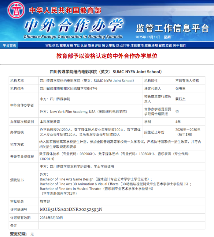 近日,经中华人民共和国教育部正式公布,四川传媒学院与美国纽约电影学院合作举办的非独立法人中外合作办学机构——四川传媒学院纽约电影学院(SUMC-NYFA Joint School)获准设立。这是四川传媒学院深入贯彻落实中央《关于做好新时期教育对外开放工作的若干意见》及《四川教育强省建设规划纲要(2025-2035)》精神,主动服务国家教育对外开放和文化“走出去”战略,持续深化中西部地区教育国际交流与合作的一项重要成果,这是四川传媒学院成为西部地区第一所获批中外合作办学机构的民办高校。标志着四川传媒学院在国际化办学与高水平应用型人才培养方面迈出关键一步。