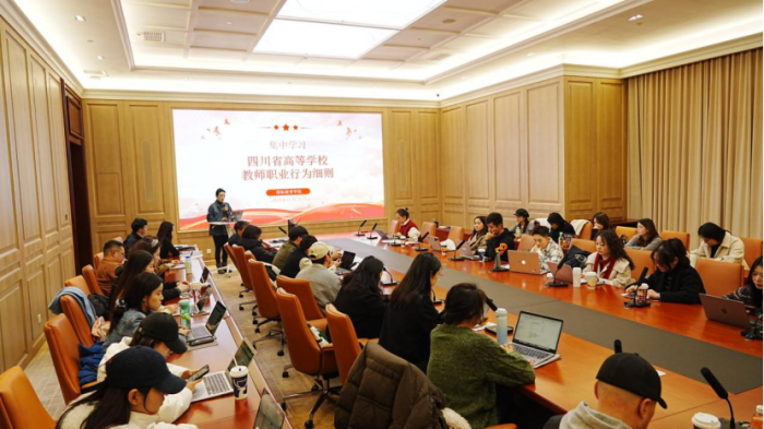 随后,学院党总支副书记苏雪妮带领全体教师集体学习《四川省高等学校教师职业行为细则》。通过逐条研读与重点解析,全体教师进一步明确了高校教师的职业行为规范与责任担当,增强了恪守师德、廉洁从教的自觉性,共同营造风清气正的育人环境。