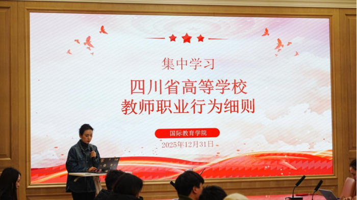 为深入贯彻党的教育方针,进一步加强师德师风建设,筑牢新时代教师队伍的思想根基,2025年12月31日,四川传媒学院国际教育学院召开师德师风建设专题学习与表彰分享会。学院党政领导及全体教师共同学习准则,表彰先进,聆听榜样故事。