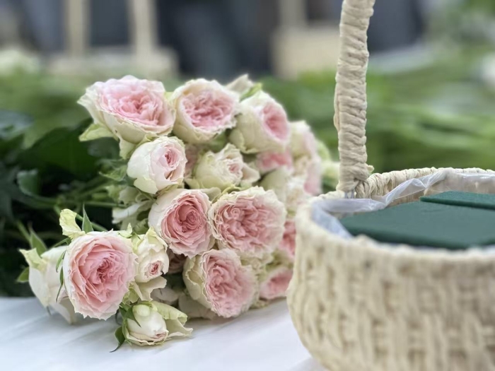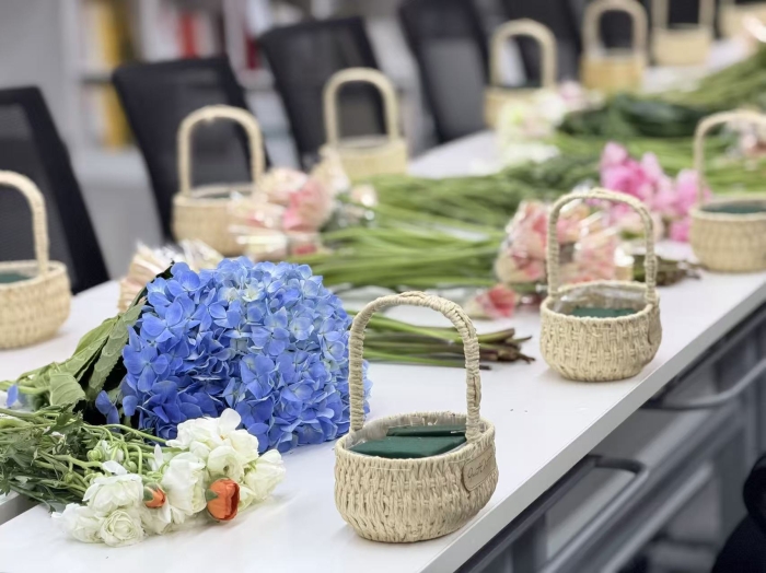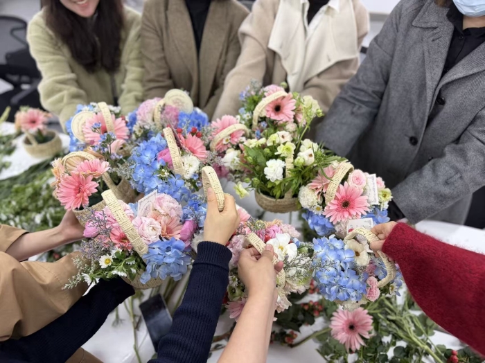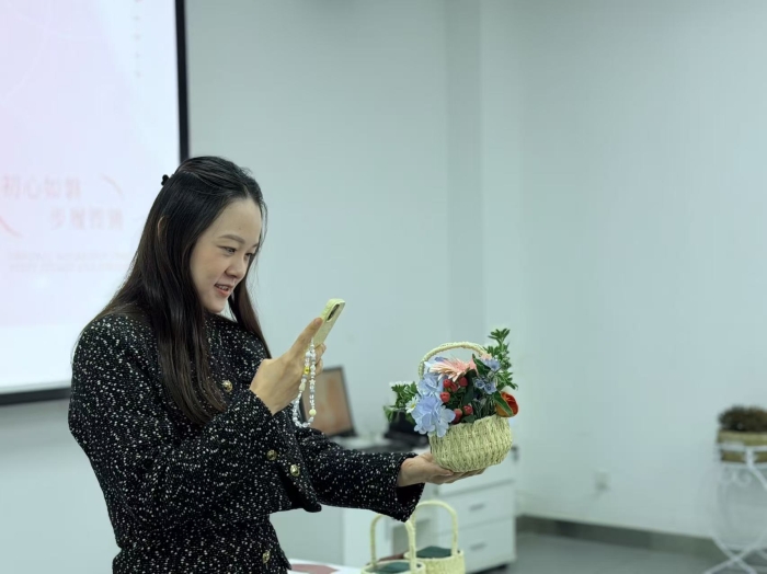 活动现场花香四溢,欢声笑语。在专业花艺师的指导下,老师们巧手翻飞,精心构思,将一朵朵鲜艳的洋牡丹、清雅的绣球花、蓬勃的非洲菊等花材,错落有致地插入精巧的藤编花篮中。