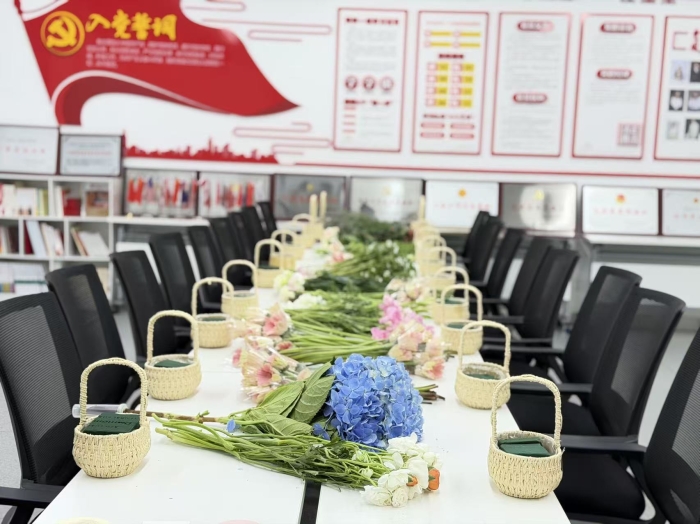 活动的背景设计别有深意,当老师们俯身精心修饰自己的花艺作品时,背景墙上,鲜红的党旗与庄严的入党誓词静静矗立,“党员义务”、“党的纪律”等展板内容清晰可见。