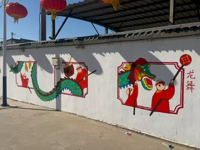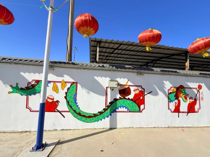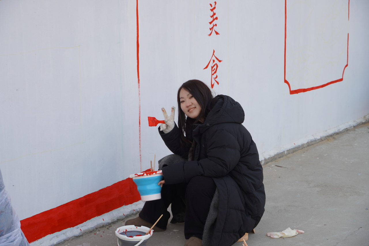 该生全程参与田庄台非遗主题墙绘的设计与绘制结合古镇定位构思文化地标、民俗活力、美食记忆三大节点设计方案,融入仿古牌坊、舞龙场景、非遗美食等本土元素,从颜料调和、线条勾勒到细节描边躬身实践,亲力亲为完成每一个环节,让原本静态陈列的非遗文化,转变为乡村公共空间中可看可感、兼具文化底蕴与视觉美感的 “活态景观”,用创意与实干为乡村文化空间赋能。