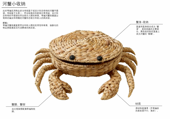 深度参与团队文创产品研发工作,聚焦“非遗+实用”核心方向,为“河蟹小收纳”苇编文创、田庄台非遗美食伴手礼包装提供核心设计思路。结合大洼河蟹文化、苇编技艺特色,优化产品造型与视觉体系,推动传统非遗技艺与现代生活需求、市场消费场景深度融合,为非遗的产业化转化提供了青年方案。